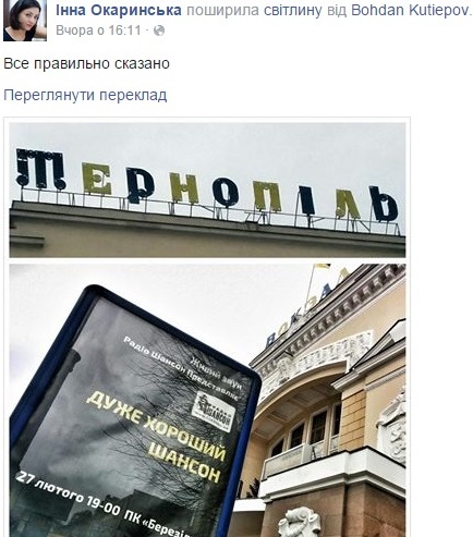 Що цікаво, цей пост Кутєпова поширила і дружина місцевого депутата міської ради Тернополя, свободівця Михайла Окаринського, Інна. Нагадаємо, усю повноту влади у муніципальному органі Тернополя ось уже п’ятий рік мають саме свободівці на чолі з Сергієм Надалом, якого той же пан Михайло Окаринський в якості піарника чи політтехнолога, як кому подобається, разом з компаньйоном Фартушняком і привів до влади в обласному центрі екс-подаківця Надала.