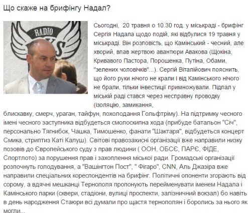 Мусора дуже ризикують, що відпустили Камінського. Це єдина ниточка до Надала на сьогоднішній день. Не стане Камінського і кінці в землю. А, враховуючи, що головний свідок проти Надала має проблеми з тиском (це чітко зафіксовано лікарями і не однієї лікуарні Тернополя), то цілком ймовірно, що Беня хлюпне йому пару капельок до кави і в діло в шляпі. В Камінського в звязку із нервовим стресом станеться інсульт чи інфаркт і алібі буде стопроцентне в Бен-Ладана. Хитрющий податківець з мільйонами доларів, звичайно, може придумати ще більш екзотичніший кінець побратиму. Скажімо доручить Джиджорі цю роботьонку, а той вже щось придумає, бо і на ньому шкура горить. Як не як, вибори на носі, а