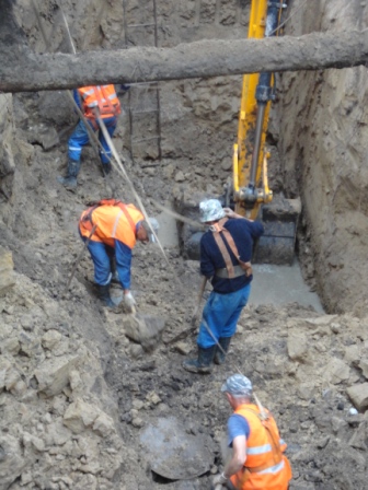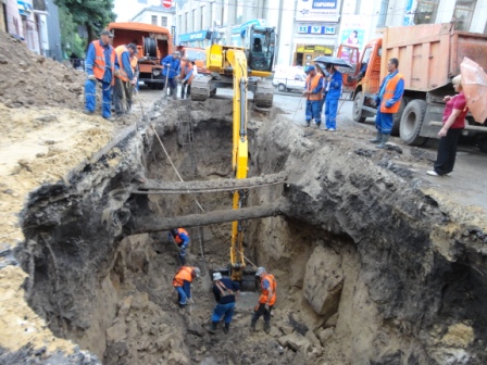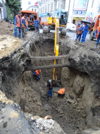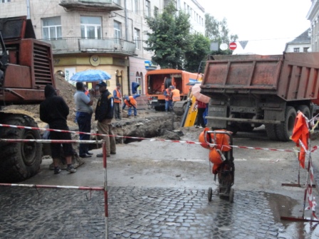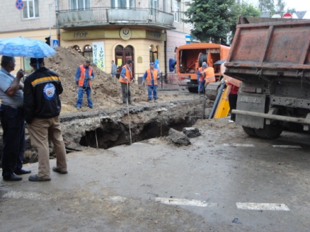 Коли у більшості тернополян робочий день вже закінчився, комунальні служби й далі працюють, розчищуючи провалля в центрі міста. Величезна яма вже в діметрі метрів 15 і майже повністю прорита через вулицю Руська. Глибина провалля сягає метрів 8-9. За найоптимістичнішими прогнозами відновлювальні роботи триватимуть щонайменше добу.