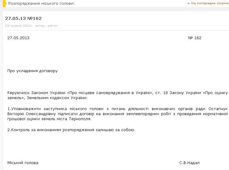 Міський голова Тернополя видав розпорядження «Про укладення договору»